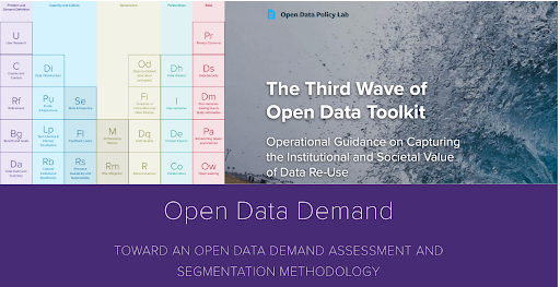 - Open Data Demand Methodology: The GovLab, in partnership with the Inter-American Development Bank, and with the support of the French Development Agency developed the Open Data Demand and Assessment Methodology (Beta) to provide open data policymakers and practitioners with an approach for identifying, segmenting, and engaging with demand.