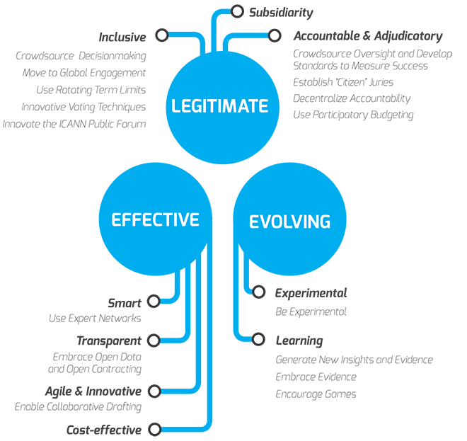 According to Panel Chair Prof. Beth Simone Noveck, the aim of the panel has been not to tackle global issues of Internet governance, but to “articulate what a 21st century ICANN, whose functions are quite narrow, could look like and how it could operate given the innovations in governance happening across the world.” With that in mind, the below presents the initial draft blueprint summarizing the Panel’s recommendation to ICANN for evolving how it operates and collaborates across borders in the 21st century. This draft blueprint can also be accessed in pdf form here.